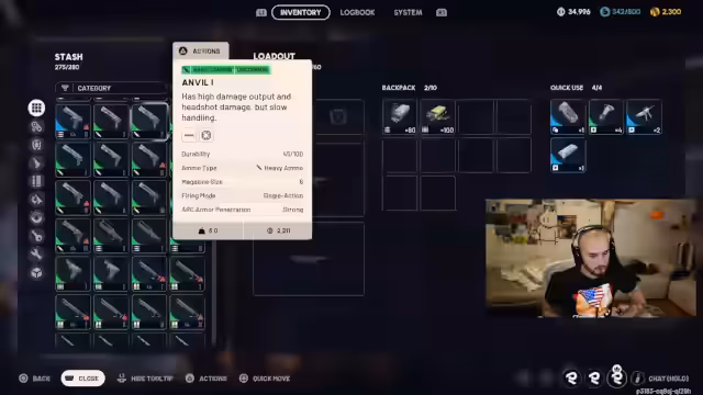01:33:07Das Spiel wird als kostenpflichtig (30€) vorgestellt, aber als extrem populär beschrieben, da es viele Leute spielen. Es folgt eine erste Runde mit Tutorial-Elementen: Waffen wie die Venator werden erklärt, Munitionstypen (schwer/mittellicht) und deren Wirkung auf Gegner und Drohnen demonstriert. Der Streamer zeigt Grundmechaniken wie das Heilen von Teammitgliedern, das Ablegen von Waffen (H-Taste), Sliden bergab (C-Taste) und den Sichtwechsel (X-Taste). Das Prinzip von Extraction-Spielen wird erklärt: Was man mitnimmt, verliert man beim Tod, der Rest bleibt im Lager. Es folgt ein erstes PvP-Gefecht, bei dem das Team Gegner ausschaltet und deren Loot an sich nimmt.