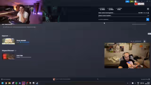 04:06:35Der Streamer testet Download-Zeiten von Spielen auf Steam. 'Liars Bar' (17 GB) lädt in 40 Sekunden herunter, was als flex bezeichnet wird. Max Payne (33 GB) dauert knapp 3 Minuten. Es folgen Diskussionen über die Ursachen der Schwankungen (SSD, Steam-Server). Später zeigt ein PUBG-Download (30 GB) zunächst 5 Stunden, dann dank besserer Konfiguration 54 Minuten. Der Streamer lädt Zuschauer über Steam-Freundschaftsanfragen ein und diskutiert Lamborghini-Kooperationen wie Yachten und Villen.