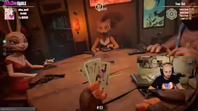 05:04:25Der Streamer stellt ein Spiel mit Karten vor, bei dem es um Bluffen und strategisches Aufdecken geht. Er erklärt die Grundregeln, zeigt seine Hand mit zwei Königen und demonstriert, wie man durch geschicktes Legen und Vortäuschen den Gegner manipulieren kann. Dabei nutzt er provokante Sprüche und vergleicht das Spiel humorvoll mit einem 'Fickhäschen', um die Runde aufzuheitern. Die Dynamik zwischen den Spielern wird durch ständige Herausforderungen und Drohungen geprägt, wobei er betont, dass Angst vor der 'Kugel' (einem Verlieren) keinen Platz hat.
