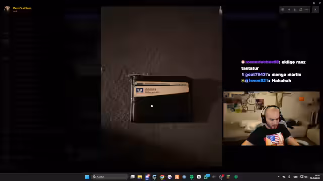 00:29:58Es werden unkonventionelle Portemonnaies gezeigt, darunter eines mit einer Landkarte von Paris, ein "Bolo-Brick"-Design und eines mit Reichsmark-Scheinen. Der Streamer interagiert direkt mit einreichenden Zuschauern, wie dem Nutzer "Naturplattform", dessen Portemonnaie er live begutachten möchte. Dabei fallen sowohl respektvolle als auch humorvolle Kommentare über die Auswahl an Geldbörsen.