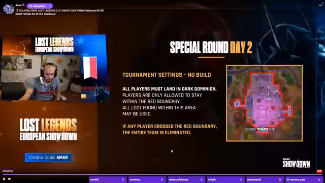 00:03:00Der Stream startet mit dem Beginn des zweiten Tages eines Fortnite-Turniers, bei dem es um Preisgelder in Höhe von 250.000 Dollar geht. Der Streamer befindet sich auf Platz 11 und hat sich ein persönliches Ziel gesetzt: Sollte das Team nicht unter die Top 5 kommen, muss er sich das Kürzel 'HS' als Tattoo stechen lassen. Neben der sportlichen Herausforderung wird auch das Regelwerk und ein spezieller 'Dämonentag' mit 1,5-fachem Multiplikator angekündigt, der für zusätzlichen Druck und Drama sorgen soll. Die Stimmung ist angespannt und motiviert, denn alles steht auf dem Spiel.