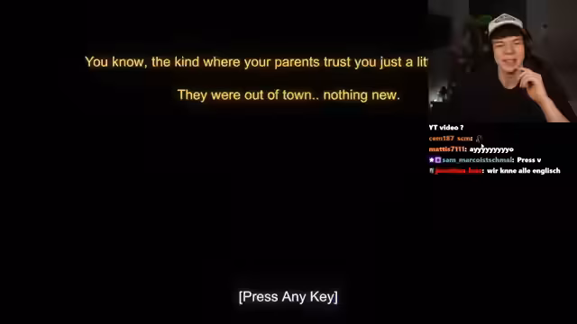 02:51:18Der Streamer beginnt das Spiel 'Intrusion', in dem er als Charakter David in einem von seinen Eltern für eine Nacht alleine gelassenen Haus agiert. Das Spiel, das als auf wahren Begebenheiten basierend beworben wird, beginnt damit, dass David aufwacht, eine Notiz seiner Mutter findet und sich alleingelassen fühlt. Der Streamer interagiert stark mit dem Chat, fragt nach, was die Zuschauer in seiner Situation tun würden und erforscht das Haus, Hinweise sammelt und findet eine Liste mit Aufgaben, wie das Abendzubereiten und das Aufräumen des Zimmers. Wichtiger ist jedoch die Frage, wer die mysteriöse Carla ist, die Nachbarin, zu der seine Mutter ihn schickt, wenn er Hilfe braucht.