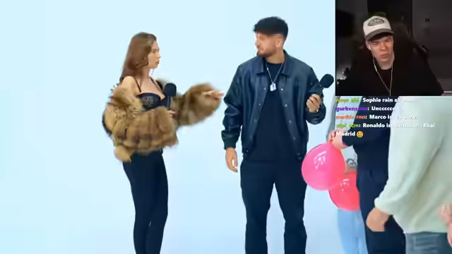 01:15:10Nach den ersten Eliminierungen präsentiert der Streamer die verbliebenen vier Kandidaten näher. Jeder von ihnen muss sich erneut vorstellen und seine Gründe für die Beibehaltung des Ballons nennen. Die Frau stellt ihnen weitere Fragen, um ihre Charaktere besser einschätzen zu können. Ein wiederkehrendes Thema ist das Interesse an Raver-Kultur, wobei die Kandidaten hier sehr unterschiedliche Ansichten und Erfahrungen zeigen. Der Streamer und der Chat bewerten die Antworten und geben humorvolle Kommentare dazu.