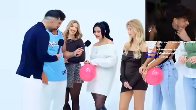 01:14:43Der Stream wechselt zu einem Format namens 'Ballong Date', eine Datingshow. Der Moderator Momo begrüßt die Zuschauer und stellt neun Single-Frauen vor. Anschließend betreten neun Männer den Raum, die sich vorstellen. Der erste Kandidat ist Luca, 26, aus Koblenz, der im Pharma-Bereich arbeitet und Freizeit im Motorsport verbringt. Die Frauen erhalten die Möglichkeit, einen Ballon platzen zu lassen, wenn sie keinen weiteren Kontakt wünschen. Die erste Folge beginnt mit ersten Entscheidungen der Frauen.