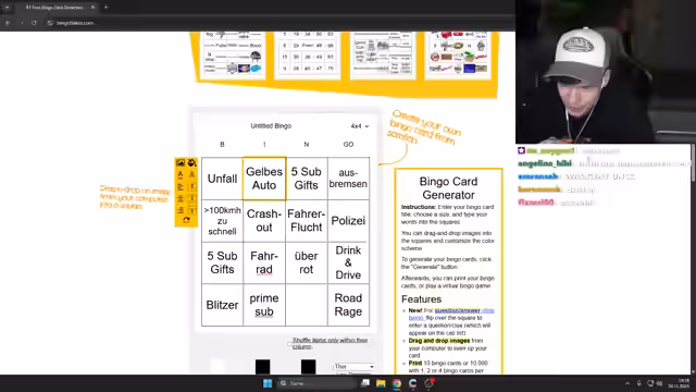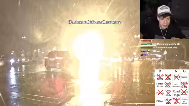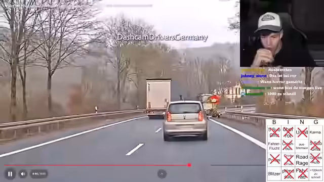 00:41:21Der Streamer startet das angekündigte Dashcam-Bingo mit drei Videos. Zuvor lässt er die Zuschauer Vorschläge für Bingo-Felder machen, darunter 'Unfall', 'Fahrerflucht', 'Ampel über Rot', 'Crash-Out', 'Road-Rage', 'Ausbremsen', 'Polizei', 'Vorfahrt nehmen', 'Blitzer', 'Drink and drive', 'Geisterfahrer', 'viel zu schnell' (über 100 km/h), 'Fahrrad' (mit einem Vorfall), 'gelbes Auto', 'gefährliches Überholen', 'Mittelfinger', 'BMW', 'Handy' und 'Karma'. Während des ersten Videos wird ein Unfall abgehakt, bei dem ein Hintermann aufgefahren ist. Eine weitere Szene zeigt einen Fahrer, der mutmaßlich betrunken war und weiterfährt. Im Verlauf des Bingos kommt es zu Diskussionen über die Definition von 'Unfall' und 'Karma'. Ein besonders kurioser Vorfall betrifft einen Unfallverursacher, der sich als Schadensgutachter ausgibt und den Schaden leugnet, bis die Polizei eingreift und die Dashcam-Aufnahmen die Situation klären.