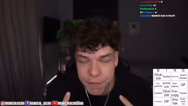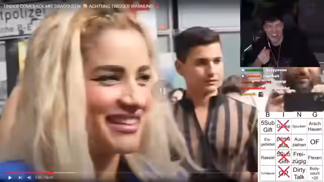 00:40:03Der Streamer zeigt den ersten Teil des Frankfurt-Tinder-Clips, in dem Bingo-Kriterien wie 'OP', 'Schönheits-OP' und 'Gurke-Typ' bereits früh erfüllt werden. Die Reaktionen der Teilnehmer sind extrem und führen zu provokanten Dialogen über Dating, Äußerlichkeiten und sexuelle Anspielungen. Der Streamer kommentiert die Szenen live und interagiert intensiv mit dem Chat, der weitere Begriffe wie 'Dirty Talk' und 'Eingebildet' im Bingo-Kasten markiert.
