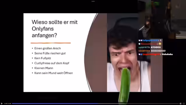 01:43:01Es werden Jugendwörter erklärt und der Streamer fragt sich, ob er "slay" sei oder "Riz" habe. Eine Präsentation erklärt, warum Finja jemand anderem gehören sollte, da der Streamer fremdgehe und Finja nicht glücklich sei. Es wird behauptet, dass der andere Bart habe und nicht vape. Der Streamer reagiert verwirrt darauf, warum jede Präsentation darüber geht, dass er vape. Es folgen weitere Präsentationen über Berufe und Getränke-Rankings. Am Ende soll eine Person gebannt werden, aufgrund ihrer Präsentation über Tauben. Eine weitere Präsentation analysiert, ob Ferb ein P sei. Abschließend wird über die beste Präsentation abgestimmt und der Gewinner gekürt, der eine OF-Präsentation gehalten hat. Der Streamer überlegt daraufhin, ob er auch wirklich OF machen sollte.