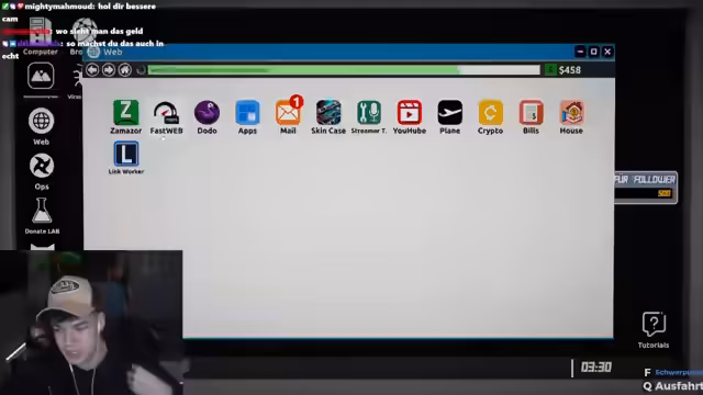 01:43:00Im Simulator muss der Streamer nun sein erstes Setup für den Live-Stream aufbauen. Er kauft eine Kamera und ein Mikrofon, hat aber massive technische Schwierigkeiten. Das Mikrofon wird nicht erkannt, die Streamqualität ist schlecht und der Stream friert ein. Er versucht verzweifelt, die Software "OBS" und "Discord" einzurichten, was aber an seiner mangelnden Expertise und dem langsamen PC scheitert. Der erste Versuch eines Live-Streams wird daher zum Desaster und wird von den wenigen Zuschauern gehasst.