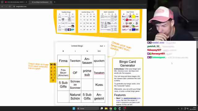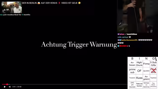 00:44:47Es wird entschieden, ein Crash-Out Tinder Berlin Video von Pumping Monkey anzusehen, nachdem die Zuschauer in einer Abstimmung dafür gestimmt haben. Ein Tomatolix-Video wird für den nächsten Tag angekündigt. Während des Videos soll ein Bingo gespielt werden, bei dem die Zuschauer im Chat Vorschläge für freaky Inhalte einbringen können, die im Video vorkommen könnten. Es werden verschiedene Begriffe und Konzepte gesammelt, die im Bingo verwendet werden sollen, darunter 'Firma', 'Spucken', 'Twerken', 'OF (OnlyFans)', 'Kuss', 'Natural schön', 'Anfassen', 'Tweaken', 'An die Leine', 'Schnee im Sommer', 'Frau Bauer (Kirschen)', 'High oder drunk', 'Gewalt' und 'U60 Typ'. Es wird betont, dass es sich um ein freaky Video handelt und die Zuschauer auf alles vorbereitet sein sollen. Es wird angekündigt, dass es Sub-Gifts zu gewinnen gibt und die Zuschauer Clips vom Video machen und auf TikTok posten sollen, wobei sie den Streamer markieren sollen.