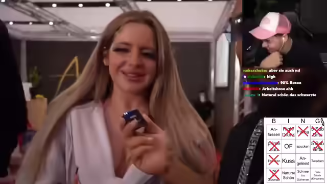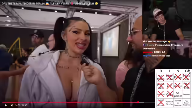 00:55:33Das Crash-Out Tinder Video von der Venus wird gestartet, und es wird direkt auf verschiedene Elemente geachtet, die für das Bingo relevant sind. Es wird festgestellt, dass es viele 'Angst am Gunnen' (Personen, die anzüglich fotografieren) gibt. Es wird spekuliert, ob eine der Teilnehmerinnen 'high' oder 'am tweaken' ist. Es wird die Frage aufgeworfen, ob es 'peinlich' ist, als Mann auf die Venus zu gehen. Mehrere Personen werden interviewt, darunter eine Frau, die sich als 'Holly Glamour' vorstellt und sagt, sie sei von der 'Presse'. Sie äußert sich anzüglich über einen Mann mit einer 'Schweinenase'. Ein weiterer Interviewpartner namens 'Ledion' gibt an, dass seine Freundin nicht auf der Venus sein sollte und er selbst nur zum 'Spaß haben' dort ist. Es wird vermutet, dass eine der Frauen einen OnlyFans-Account hat. Ein Interview mit 'Celia Schia' folgt, die sich selbst als 'die mit dem Ding Dong' bezeichnet und anzügliche Kommentare macht. 'Dustin Baba', bekannt aus Frankfurt Tinder-Videos, wird ebenfalls interviewt und äußert sich kontrovers über Celia.