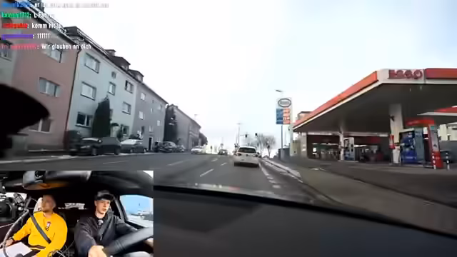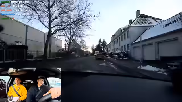 01:00:41Die Fahrprüfungssimulation beginnt mit einer Linksabbiege-Anweisung an einer Ampel. Der Fahrer ist unsicher und bemerkt, dass er beinahe in den Gegenverkehr geraten wäre, was als 'absolut dämlich' bezeichnet wird. Es wird darauf hingewiesen, durchgezogene Linien nicht zu überfahren. Der Fahrer äußert, sich bisher 'ziemlich gut' zu schlagen, obwohl ein fehlender Schulterblick kritisiert wird. Die Diskussion wechselt zu Theoriefragen, die angeblich 'richtig einfach' sein sollen, da der Prüfer ein 'Homie' des Begleiters ist. Die Route führt zum TÜV, wo der Prüfer wartet. Es wird betont, langsam und im ersten Gang zu fahren, um den Prüfer nicht zu 'ersticken'. Ein Schulterblick wird gemacht, obwohl ein Pfeil vorhanden war, was als 'in Ordnung' befunden wird. Die Fahrt geht weiter um das Gebäude herum, wo der Prüfer gesichtet wird. Der Fahrer stellt das Fahrzeug am 'Willkommensschild' ab, macht den Motor nicht aus, legt den Leerlauf ein und zieht die Feststellbremse an, während technische Anpassungen für die Kamera vorgenommen werden.