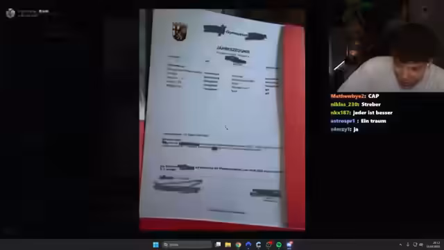 01:38:58Der Stream beginnt mit intensiven Diskussionen über Zeugnisse im Chat. Der Kommentator äußert sich zu seltsamen Schulfächern wie 'Knabenturnen' und 'Beschäftigungsabsatzprozesse'. Es werden verschiedene Zeugnisse vorgestellt und dabei besonders die hohen Fehltage und ungenügenden Noten diskutiert. Ein prägnantes Beispiel ist ein Zeugnis mit 54 unentschuldigten Fehltagen in der sechsten Klasse, was zu scharfen Kommentaren und Zweifeln an der Echtheit führt. Viele Zeugnisse zeigen Muster schlechter Noten, besonders in Sport und Mathe, und der Streamer berichtet von eigenen Erfahrungen mit extremer Abwesenheit in der Schule.