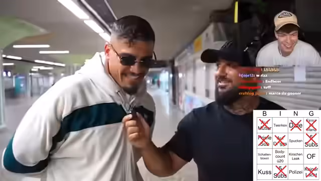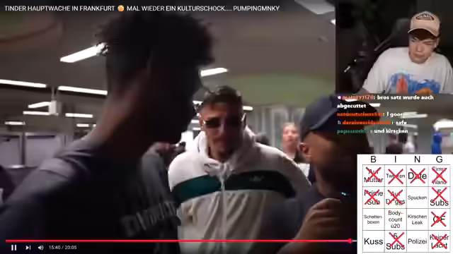 01:15:59Es wird beschlossen, doch ein Bingo zum "Frankfurt Tinder"-Video zu veranstalten. Die Regeln werden erklärt: Es zählt erst, was nach dem Drücken des Play-Buttons passiert. Die Zuschauer werden aufgefordert, Vorschläge für das Bingo zu machen. Genannte Vorschläge sind unter anderem "OF" (OnlyFans), "Spucken", "Rassistisch", "Kirschenleak", "Niemand lacht", "Stille", "Auf Mutter", "Twerken", "Sacken", "Date", "Bodycount Ü20", "Polizeieinsatz", "Schattenboxen", "Auf Drugs" (zensiert), "Kopfschmerzen" und "Firma an Wand". Es wird betont, dass es sich um etwas Neues handelt und die Zuschauer aufgefordert werden, für dieses Bingo zu wählen.