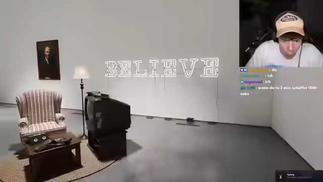 02:42:00 Ja! Ist besser? Ich mach noch höher. Jetzt ist chillig. Passt so, Chat? Passt so? Eins in Chat, wenn so passt. Ich glaub, so passt. So ist fresh, so ist fresh. Mach 6, 7 FPS. Okay. Nein, das ist besser. Okay, krieg ich irgendwie... Krieg ich irgendwie ne Erklärung? Was muss ich machen? Yo, ist das ein Game, in dem ich einfach nur in einem Kunstmuseum bin? Wollt ihr mich verarschen? Ich bin einfach nur in einem Kunstmuseum.