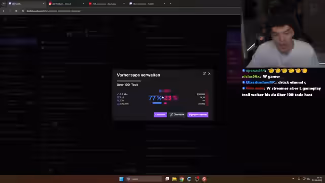 02:39:43Die immer wiederholten Misserfolge führen zu einer massiven Frustration des Streamers, der die hohe Schwierigkeit des Spiels stark in Frage stellt. Er beschimpft teilweise die Spieleentwickler und das Game-Design, das seiner Meinung nach zu künstlich schwer ist. Parallel dazu reagiert er sensibel auf den Chat; hört zeitweise auf Ratschläge, widerspricht ihnen aber auch vehement, wenn sie seiner Meinung nach zu Risikoreichen sind oder zu Misserfolgen führen.