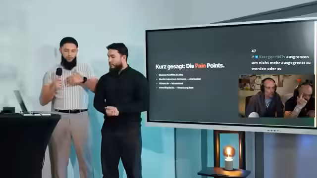 02:42:32Ein Startup-Team stellt eine muslimische Software-as-a-Service-Plattform namens Mina (Muslim Innovation and Networking Alliance) vor. Das Ziel ist eine All-in-One-Plattform und Community für muslimische Unternehmer und Fachleute. Die Gründer adressieren spezifische Schmerzpunkte wie Konflikte bei der Berufstätigkeit wegen Hijab oder Gebetszeiten. Sie bieten 15% Firmenanteile ohne finanzielle Erwartung an, insbesondere als Kooperation mit Enesker, um das Marketing zu stärken.