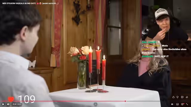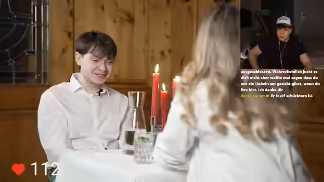 02:15:38Während des Koch-Dates nehmen die intimen und unkonventionellen Momente zu, darunter eine Fußmassage und unklare nonverbale Signale zwischen den Partnern. Beobachter vermuten, dass die gesamte Situation möglicherweise gescriptet ist. Streamer und Chat diskutieren über die Authentizität des Formats und über die unmögliche Annahme, dass einer der Teilnehmer nur auf die Ferne gesteuert wird. Ein Höhepunkt ist die geplatzte Annahme, dass die Dame den Herrn ablehnt.