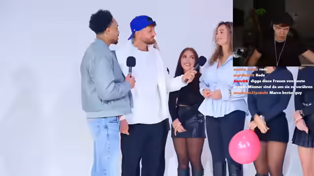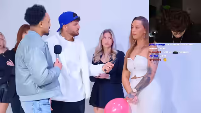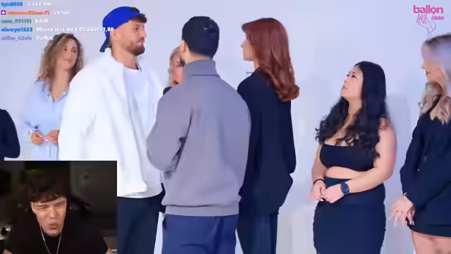 01:38:28Nach der Präsentation verschiedener Klingeltöne kündigt der Streamer das bekannte Format 'Pop the Balloon' an. Er begrüßt die Zuschauer und erklärt die Regeln: Teilnehmer präsentieren sich, und die Frauen im Publikum entscheiden anhand eines Ballons, ob sie für eine potenzielle Verabredung interessiert sind. Der Streamer preist die Moderation des Formats, lobt die Zeit und Mühe der Mods, die das Format ermöglichen, und lädt neue Zuschauer ein, den Kanal zu abonnieren. Es folgt die Begrüßung der ersten neun Frauen, die in einem Line-up auf der Bühne stehen.