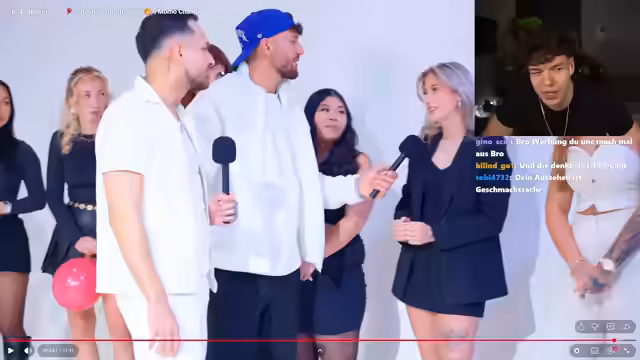 02:36:19In der finalen Runde stellt der Streamer den verbliebenen Männern eine Frage: 'Gibt es eine Seite an euch, die nur wenige Menschen kennen?'. Die Teilnehmer reflektieren ihre introvertierte Seite, ihre Familie oder ihre Verbundenheit mit engsten Freunden. Die Frauen der Jury geben ebenfalls Einblicke in ihre Persönlichkeit. Die Atmosphäre wird persönlicher und die Runde schließt mit einem humorvollen Fazit des Streamers, der die Vorstellungsrunde als gelungen betrachtet.