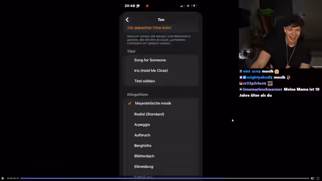 00:45:14Der zweite Hauptinhalt des Streams ist die Reaktion auf Einsendungen von Zuschauernklingeltönen. Die meisten Klingeltöne werden als zu leise, zu laut, unüblich oder unpassend bewertet. Einige finden besondere Beachtung, wie der Rettungsschwimmer-Beat oder ein Beatbox-Sound. Parallel dazu werden Memes und Geräusche wie Brain Rot Edits kommentiert. Es entsteht eine unterhaltsame Atmosphäre, in der der Streamer die Kreativität und Skurrilität der Einsendungen bewundert und gleichzeitig über den Musikgeschmack des Chats spottet.