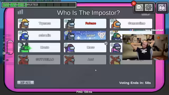 03:01:38Im weiteren Verlauf des Spiels gerät Schradin zunehmend in den Fokus der Verdächtigungen. Mehrere Spieler, insbesondere Rohat, äußern den starken Verdacht, dass Schradin der Imposter ist. Dies basiert auf seinem Verhalten und einer voreiligen, falschen Anschuldigung, die Maus gegenüber geäußert wird. Schradin selbst beteuert seine Unschuld und versucht, sich zu verteidigen, aber die Lobby bleibt skeptisch und fordert eine Abstimmung gegen ihn, um den Verdächtigen auszusortieren.