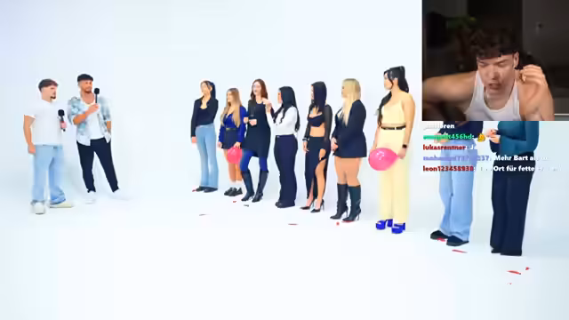 01:22:57Zu Beginn des Streams werden mehrere männliche Kandidaten vorgestellt, die sich kurz selbst beschreiben. So stellt sich Arnie, 24 aus Köln, vor, der gerne ins Fitnessstudio geht und auf Events unterwegs ist. Er betont, dass ihm ein respektvoller Umgang und ein gepflegtes Äußeres bei einer Frau wichtig sind. Weiterhin wird Philipp, Fräser aus der Nähe von Koblenz, vorgestellt. Sein Fokus liegt auf humorvollen Charakter und einem passenden Vibe mit einer Frau, während Rauchen ein absolutes No-Go für ihn ist. Auch Manuel, 28 aus Gummarsbach und angebliches Model für LFDY, stellt sich vor und gibt an, dass ihm Loyalität und Ehrlichkeit in einer Frau wichtig sind. Die Frauen im Stream äußern bereits erste Vorlieben, beispielsweise die Ablehnung von Bartträgern oder eine Präferenz für Südländer.