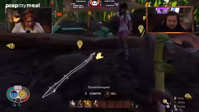 09:49:57Nachdem die technischen Probleme gelöst sind, startet die Grounded-Runde erfolgreich. Der Streamer und seine Mitspieler sind in der Welt geschrumpft und müssen die Grundlagen fürs Überleben meistern. Er erklärt die grundlegenden Mechaniken wie Sammeln von Ressourcen, Herstellen von Werkzeugen und der Nahrungsaufnahme. Es gibt erste Kämpfe mit Insekten wie Marienkäfern und die ersten Siedlungsbauten entstehen.