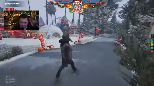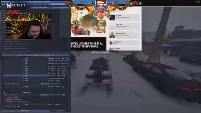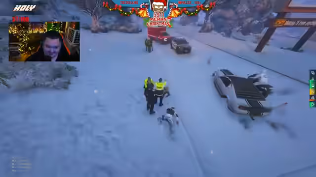 02:33:08Während einer Verfolgungsjagd in Fahrzeugen kommt es zu einem Unfall nahe dem Weihnachtsmarkt. Der Streamer und sein Team verfolgen ein Ziel, verlieren aber die Spur oder verursachen einen Zusammenstoß. Nach dem Aufprall folgt ein Roleplay-Szenario mit medizinischer Versorgung: Sie rufen den Notruf (EMS), klären Verletzungen (Handgelenkschmerzen, Prellungen) und diskutieren über die Schmerzskala (3,61 cm). Die Szene endet mit der Ankunft von Rettungskräften und weiteren Absprachen zur Behandlung der Verletzten.