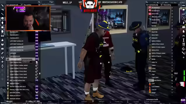 12:40:48Es wird erwähnt, dass German Chaos Theory einen Raid durchgeführt hat. Es wird angekündigt, dass ab dem nächsten Tag Rösti Pommes gemacht werden. Es wird über die Personalisierung von Loadouts gesprochen und wie man diese speichern kann. Es wird festgestellt, dass es keine Mülltüten gibt, stattdessen wird eine Beweistüte verwendet, um Gegenstände zu verstauen. Es wird überlegt, ob man wieder einen Mülleimer einführen sollte. Die Kosten für eine Tüte werden mit 35 von 100 angegeben. Es wird über eine Kamerareparierungsdienstbox und deren Inhalt spekuliert. Ein Prio-Einsatz wird reingekommen. Es wird festgestellt, dass man sehr viel mitnehmen kann, mehr als vorher. Es wird überlegt, ob man Snake auf dem Handy spielen soll, wenn man lange Weile hat. Es wird diskutiert, wie man das A3F Police Schild bekommt und dass es für die Sheriffs ist. Es wird über die SWAT Uniform V2, made in Kavala, gesprochen und wie sie aussieht.