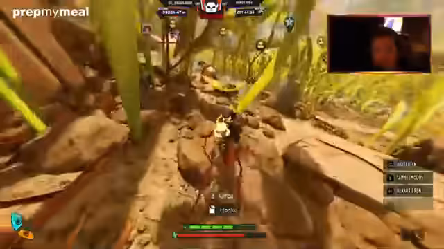 00:43:01Der Streamer und seine Mitspieler begeben sich gemeinsam in eine Höhle, um weitere Ameiseneier zu sammeln. Der Weg dorthin ist gefährlich und voller Gegner wie Skorpione und Spinnen. Es kommt zu mehreren hektischen Kämpfen, bei denen die Spieler auf ihre Rüstung und Verbände angewiesen sind. Die Steuerung der Haustiere im Kampf wird thematisiert, um gegnerische Aggro auf sich zu lenken. Der Höhleneingang wird als verwirrend beschrieben, da man sich leicht verlaufen kann.