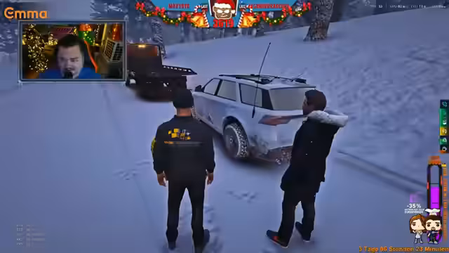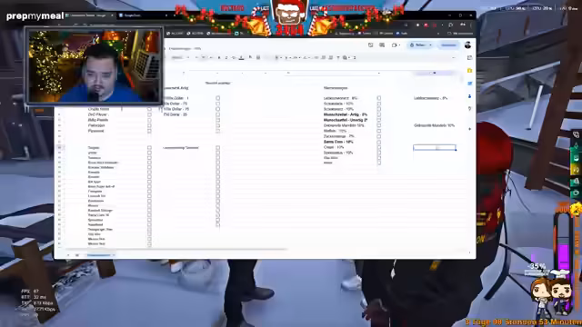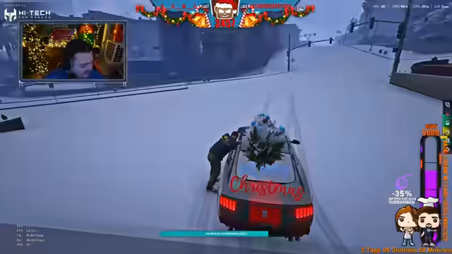 03:01:35Es wird eine wichtige Änderung am Fahrwerk des Bravado-Fahrzeugs vorgenommen, da es aufgrund eines ursprünglich überpowerten Fahrwerks und einer zu hohen Bodenhaftung extrem schnell war. Der Streamer gesteht, dass dies möglicherweise sein Fehler war, da er das Fahrwerk aus Spaß erstellt hatte, es aber versehentlich mit der falschen Bodenhaftung abgegeben wurde, wodurch das Fahrzeug wie Kaugummi klebte und jede Unebenheit enorm aufnahm, was zu Geschwindigkeiten von fast 200 mph mit vier Personen führte. Er arbeitet daran, dies zu korrigieren, damit das Fahrzeug nicht mehr das beste ist. Parallel dazu werden die kulinarischen Angebote für den Weihnachtsmarkt geplant. Neben Klassikern wie Bratwurst im Brötchen und Krakauer werden auch Champignons mit Knoblauchsoße, Langosch, Burgunder Schinken und Folienkartoffeln mit Joghurt in Betracht gezogen. Als Getränke sind Glühwein, Kaffee, Apfelpunsch, Kinderpunsch, alkoholfreier Glühwein, Feuerzangenbowle und heiße Schokolade geplant, wobei auch Kakao mit Schuss erwähnt wird. Die Dekoration des Kamins und des Weihnachtsbaums ist bereits fertig, die Lichterkette hängt, aber der Baum ist noch nicht geschmückt. Der Weihnachtsbaum soll bis März stehen bleiben, da ein Umzug ansteht und ein erneutes Umdekorieren vermieden werden soll.