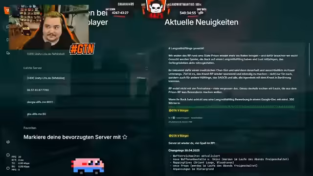 00:54:17Der Streamer spielt auf dem Unity-Server und berichtet von einer Diskussion über vergangene Konflikte mit anderen Fraktionen wie Lost und Saints. Er erwähnt einen Serverwechsel zu Play-V, um das Gelände zu erkunden, und kritisiert die damaligen Situationen wie RDM (Random Deathmatch) und VDM (Vehicle Deathmatch). Er unterhält sich über die Vorteile von QuantV, insbesondere den roten Himmel bei Nacht. Der Streamer äußert seine Frustration über die Serverprobleme und testet parallel einen anderen Server, Playbee, was jedoch ebenfalls auf technische Schwierigkeiten stößt.