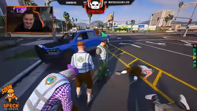 04:47:53Bei einem Razzia-Einsatz bei der Fahrschule kommt es zu einer Konfrontation mit der Polizei. Ein Angestellter wird niedergeschlagen und das Team muss fliehen. Es kommt zu chaotischen Szenen, bei denen mehrere Autos beteiligt sind und das Team sich aufteilt. Die Aktion endet in einem Desaster, wobei auch ein Fahrzeug beschädigt wird und einige Teammitglieder sich verletzt haben könnten.