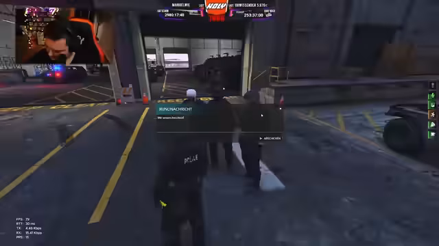 03:49:36Es finden verschiedene kriminelle Aktivitäten statt. So wird ein Fahrzeug bei einem Verkehrsunfall beschädigt und ein Deal mit einem Ex-Baller abgewickelt, der Waffenteile besitzt. Nach dem Deal stellt der Streamer fest, dass der Verkäufer von keiner Gang ist, was die rechtliche Lage kompliziert macht. Parallel dazu wird ein Gespräch mit der Polizei geführt, das in einer Konfrontation eskaliert. Die Gruppe maskiert sich und plant, die Aktion fortzusetzen, während die Polizei sie observiert und zur Deregistrierung auffordert.