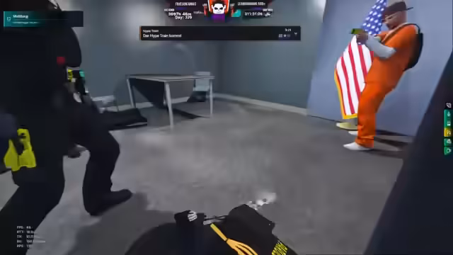 00:48:55Die Stream-Szene wechselt in ein fiktives Gefängnis, in dem der Streamer als Wärter agiert. Es kommt zu einem Ausbruch, der eine hitzige Verfolgungsjagd nach sich zieht. Der Flüchtling wird mit einem Taser niedergestreckt und anschließend zurück ins Gefängnis gebracht. Dort wird er von den Wärtern verhört und erhält eine drastische Strafe: über 2000 zusätzliche Haftminuten. Die Eskalation zwischen Insassen und Wärtern prägt das gesamte Szenario.
