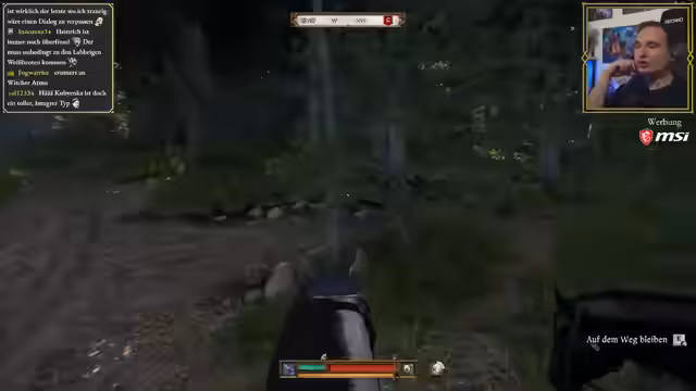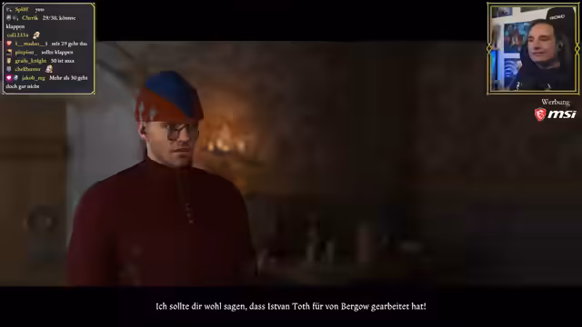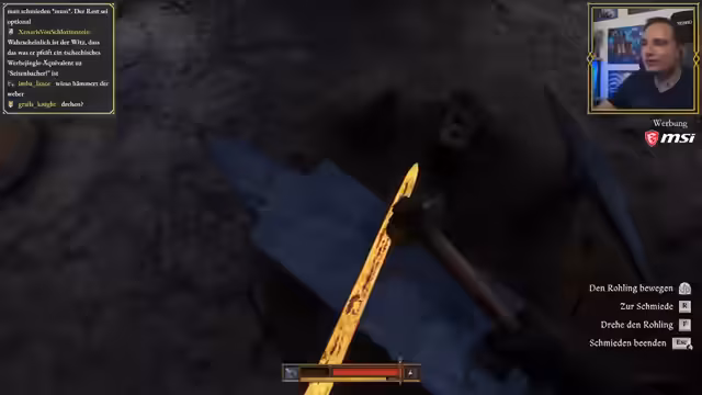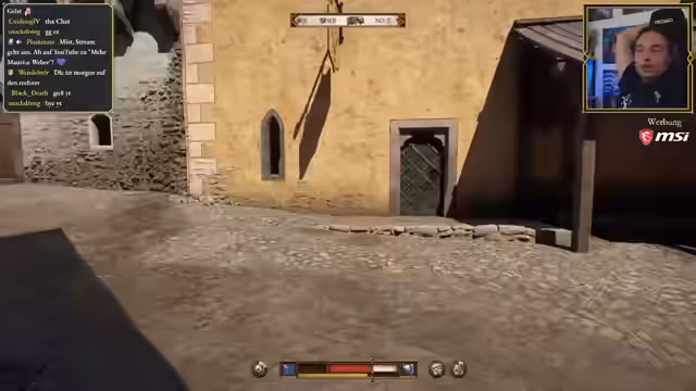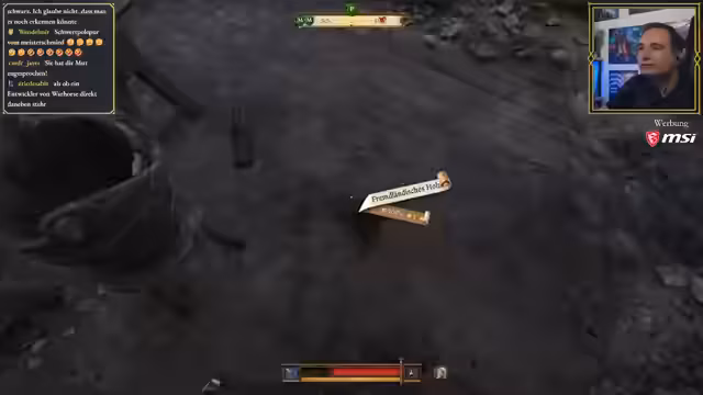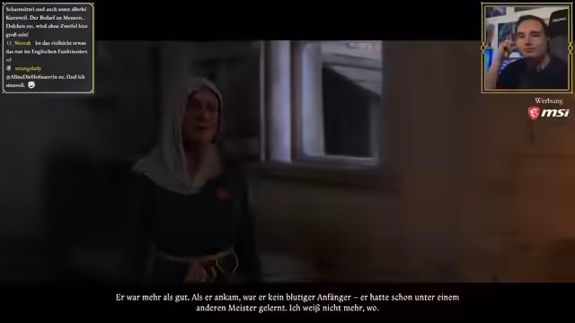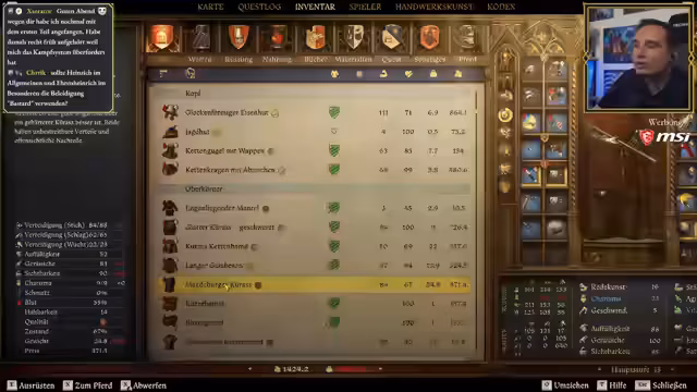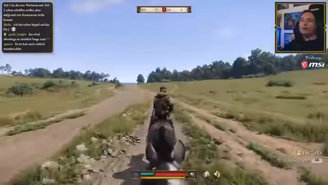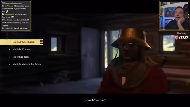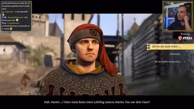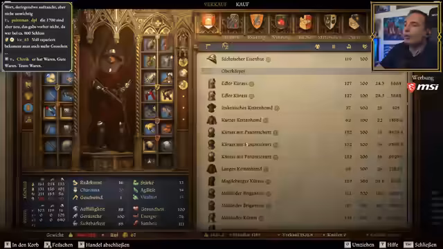 00:27:47Der Streamer lädt einen Spielstand mit 43 Stunden Spielzeit, in dem der Charakter frisch in Kuttenberg angekommen ist. Er erklärt, dass er das Spiel ausschließlich im Stream spielt, um die Zuschauer nicht zu verpassen. Der DLC soll ein Anlass sein, die Story weiterzuspielen. Der Charakter hat in einer Burg Obdach gefunden und soll nun den anderen Bewohnern guten Morgen sagen. Es wird betont, dass der Charakter als Ehrenheinrich gespielt wird, weshalb Klauen nicht in Frage kommt. Ein Gespräch mit Gerta, der Frau des Hauptmanns, ergibt, dass Heinrich sich als Schmied verdingen will. Der Streamer kommentiert sein Charisma-Outfit, das zwar gute Werte hat, aber schlecht aussieht. Es folgt ein Dialog mit dem Hauptmann über eine heruntergekommene Festung, der jedoch als zu blöd empfunden und abgebrochen wird. Stattdessen wird Rubble in einem Kampf besiegt und eine Armbrust als Belohnung erhalten. Der Streamer rüstet sich mit seinem Kriegsoutfit, dem Kriegshammer und der Armbrust aus, ist aber kein Fan der Handkanone.