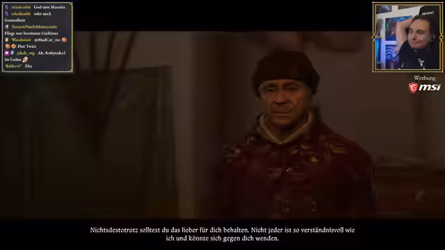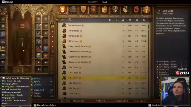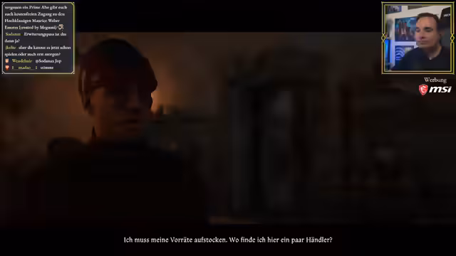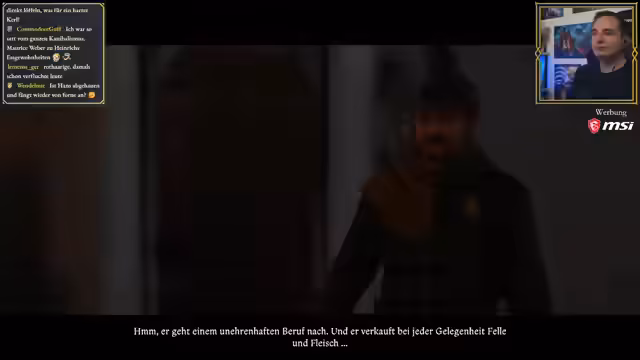00:54:20Es wird erklärt, dass man die erste Region durchgespielt haben muss, um den DLC spielen zu können und in Kuttenberg viel Geld besitzen sollte. Der Streamer setzt sein Charisma-Outfit auf, legt Parfum auf und spricht mit dem Markgrafen. Ein Gespräch mit einem Mann ergibt, dass Kuttenberg sich Sigismund ergeben hat und sein Heer die Gegend verwüstet. Es wird vor Banditenbanden in den zerstörten Dörfern gewarnt. Der Streamer fragt nach Händlern und wird an Slefka verwiesen. Es wird klargestellt, dass der DLC-Link im Chat kein Affiliate-Link ist, sondern lediglich dazu dient, die Aufrufe zu tracken. Der Streamer lehnt eine Quest des Hauptmanns Frenzel ab und unterhält sich mit Herrn Peter. Anschließend legt er Parfum auf und spricht mit dem Markgrafen, wobei er einen guten Eindruck hinterlassen will. Cickelio schlägt vor, Minze zu essen, was jedoch abgelehnt wird, da diese sogar debuffen soll.