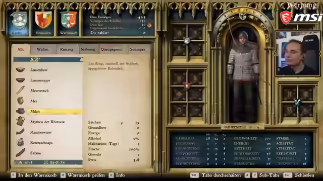 01:38:32Nach der Regeneration erkundet der Streamer sein neues Zuhause, die Mühle von Ratai. Obwohl er die Möglichkeit hat, hier zu stehlen, entscheidet er sich für einen ehrlichen Charakterweg. Er sortiert sein Inventar, legt Wert auf seine Ausrüstung, stellt fest, dass ein erbeutetes Schwert beschädigt ist und weniger Schaden beim Stich verursacht, und diskutiert den Nutzen verschiedener Kleidungsstücke im Hinblick auf Charisma und Rüstung.