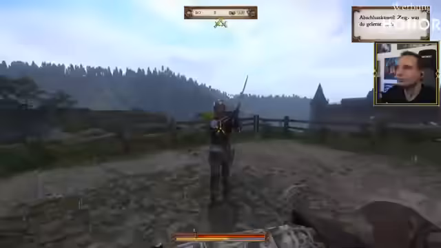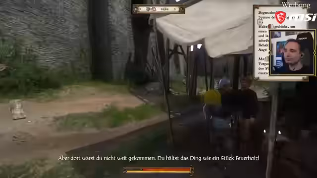 03:18:22Das Gameplay startet mit dem Erlernen des Schwertkampfs am Übungsplatz. Der Streamer erhält grundlegende Anweisungen von einem Ausbilder, die Betonung auf korperlicher Haltung, Gewichtseinsatz im Schlag und ständiger Bewegung legen. Das Kampfsystem wird als detailliert und realistisch wahrgenommen, erfordert aber viel Übung. Die Interaktion mit nicht-spielbaren Charakteren ist auf Standarddialoge beschränkt und lässt keine tiefen Gespräche zu.