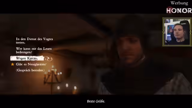 02:54:12Heinrich berichtet von dem Überfall in Skarlitz und dem Tod seines Vaters. Er wird darauf hingewiesen, dass er sein Leben nicht vergeuden soll. Heinrich bittet darum, in Dienst genommen zu werden, um all das zu erlernen. Nach anfänglicher Ablehnung wird Heinrich aufgrund seiner Loyalität und Willenskraft die Chance gegeben, sich zu beweisen. Herr Ratzig beauftragt Hauptmann Bernhard, Heinrich auszubilden und ihn dann zum Vogt zu schicken. Heinrich wird darauf hingewiesen, ihn nicht zu enttäuschen. Heinrich nimmt die Quest an. Er trifft auf einen Bettler, der von Pastera, einer Wache, bestohlen wurde. Der Bettler bietet Heinrich an, ihm das Taschendiebstahl beizubringen, wenn er ihm sein Geld zurückbringt. Heinrich lehnt ab, da er kein Dieb ist. Es wird kurz über Path of Exile 2 und die Tabaksteuer diskutiert. Heinrich bedankt sich bei seinen Unterstützern und erkundet die Stadt. Er entdeckt eine Schenke und eine neue DLC-Quest. Heinrich kauft Fleisch für seinen Hund und spricht mit den Bewohnern über die Situation der Flüchtlinge. Er macht sich auf den Weg zum Übungsplatz.