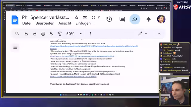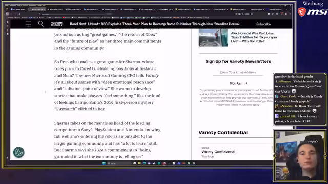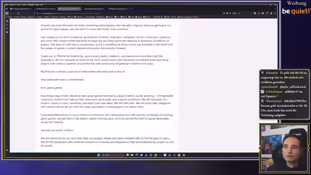 00:29:22Der Streamer leitet zur Analyse des Rücktritts von Xbox-Chef Phil Spencer über und stellt eine spontane Live-Recherche dar. Er sammelt und präsentiert die offiziellen Statements von Microsoft, Phil Spencer und der neuen Chefin Asha Sharma. Ein bemerkenswerter Fokus liegt auf Sarah Bond, Spencers designierte Nachfolgerin, die nur von ihm erwähnt wird, aber selbst kein Statement abgibt. Die Recherche offenbart Sharmas bisherige Karriere ohne direkten Gaming-Hintergrund und die Beförderung von Matt Booty, der Gaming-Erfahrung mitbringt, als Teil der Neuausrichtung.