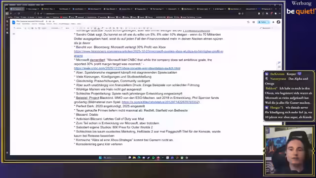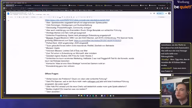 00:12:23Der Stream beginnt mit der Begrüßung des Publikums und einem ironischen Ausblick auf mögliche Desaster-Meldungen des Tages, Sony Bluepoint und Xbox-Chef Phil Spencer. Der Streamer kündigt eine umfassende Diskussion beider Themen an und stellt eine neue Kooperation vor. Nach der Begrüßung neuer und alter Follower wird die zweite langfristige Kanalpartnerschaft mit BeQuiet für Gaming-Hardware verkündet. Im Rahmen dieser Partnerschaft findet eine große Verlosung statt, bei der ein Tastatur-Maus-Set von BeQuiet gewonnen werden kann. Der Streamer betont, dass es sich um eine vertrauensvolle Zusammenarbeit handelt, da er die Produkte selbst nutzt und schätzt.