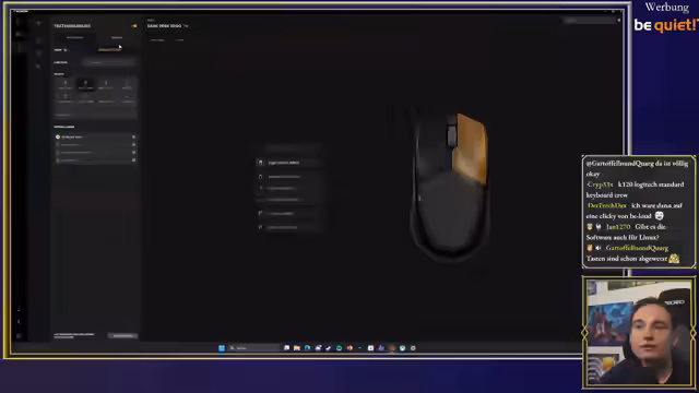 02:11:47Das zweite Hauptgewinnspiel ist die neue Dark Perk Sim Maus von BeQuiet. Der Streamer preist ihre ultra-leichte Bauweise und den High-End-Sensor, die für eine präzise Bedienung sorgen. Sie verfügt über fünf Tasten und einen physischen DPI-Schalter bis zu 32.000 dpi. Die Maus ist sowohl kabelgebunden als auch kabellos nutzbar, wobei der Streamer für seine professionelle Streaming-Setup die kabellose Variante bevorzugt, um maximale Zuverlässigkeit zu gewährleisten. Auch die Maus kann vollständig über die Software konfiguriert werden.