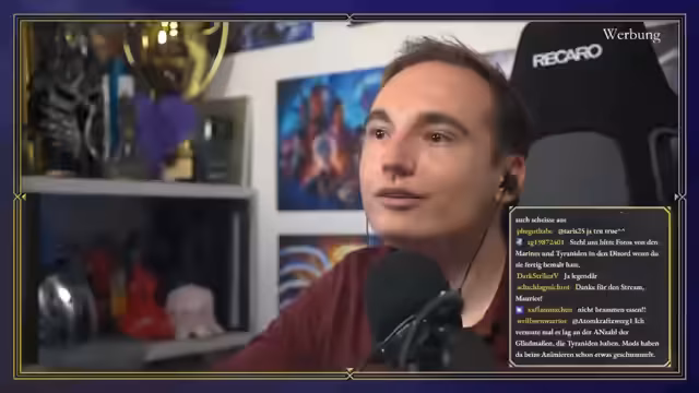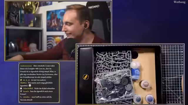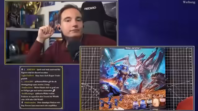 00:10:42Der Stream beginnt mit technischen Anpassungen der Kamera und des Mikrofons. Der Host stellt das offizielle Warhammer-Sponsoring vor, das aus drei Teilen besteht: dem Anschauen des Skullstreams, dem Bemalen einer Figur vor den Kameras und dem anschließenden Spielen eines Warhammer-Spiels nach Wahl der Zuschauer. Eine Freundin hat ihm eine Figur ausgeliehen, die er vorstellt, um die Kunst des Malens zu demonstrieren. Er bittet die Community um konstruktive Tipps beim Malen und warnt vor aggressivem Backseat-Painting.
