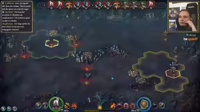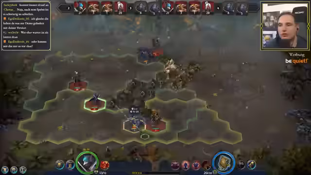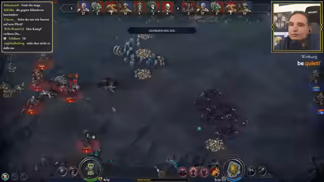 01:40:03Der Streamer entdeckt die Bedeutung von Moral im Spiel, die zu zwei Zügen pro Runde führen kann. Er lernt, dass Warten die Zugreihenfolge verändert - das Warten einer Einheit verschiebt sie in der Initiative-Reihenfolge nach hinten. Der Streamer erklärt, dass schnellere Einheiten, die warten, später dran sind. Diese Erkenntnis hilft ihm, seine Taktik anzupassen und effektiver zu kämpfen.