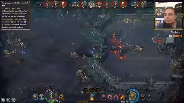 03:04:44Der Streamer muss eine wichtige diplomatische Entscheidung treffen: ein Bündnis mit Nekromanten schließen oder den Abendrotvertrag brechen. Er entscheidet sich für die Nekromanten, was zu Konflikten mit Templern führt. In den sich anschließenden Kämpfen zeigt der Streamer verschiedene Taktiken, wie die Positionierung seiner Einheiten und den gezielten Einsatz von Fähigkeiten wie Skelettsbeschwörung. Die Kämpfe sind oft knapp erarbeitet und erfordern taktisches Geschick, besonders gegen starke Einheiten wie Schattenritter.