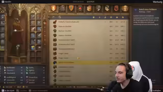 01:46:28Auf dem Ritt trifft Ehren-Heinrich auf eine Karawane von Händlern, die von Banditen bedroht wird. Nachdem die Banditen überwältigt sind, plündert er ihre Ausrüstung. Die Beute umfasst wertvolle Gegenstände wie einen Kyras, Gambeson, Panzerhandschuhe und ein Ritterlangschwert, was ein Upgrade für die aktuelle Ausrüstung darstellt. Nachdem die Gegenstände evaluiert wurden, wird der Beutezug mit weiteren Kampf gegen unerwartete Banditen fortgesetzt und erfolgreich abgeschlossen.