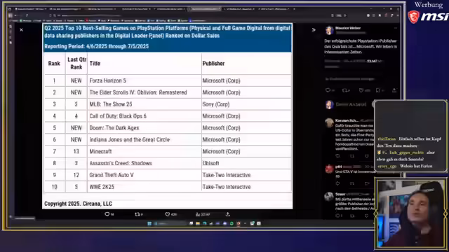 05:07:36Der Streamer beginnt mit der Feststellung, dass die Abosounds im Stream nicht mehr zu hören sind, obwohl er sie noch hört. Er vermutet einen Bug an der Schnittstelle zwischen OBS und Twitch, da an den Einstellungen während des Streams nichts geändert wurde. Dies ist nicht das Schlimmste, weshalb er das Problem auf nächstes Woche verschiebt und sich wieder an die Gaming-News erinnert. Eine Ankündigung war, dass Microsoft im letzten Quartal der erfolgreichste Publisher auf der PlayStation war. Diese Multiplattform-Strategie scheint aufzugehen, auch wenn man es nicht eingesteht. Assassin's Creed Shadows platzierte sich trotz negativer Berichterstattung auf Platz 8, was Gerüchte über eine Manipulation der Verkaufsdaten entkräftet.