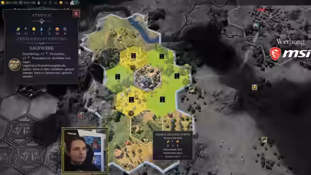 01:08:07Nach einer kurzen Einführung in die Grundkonzepte von Civilization 7 wie Zeitalter, Vermächtniswege und Siegbedingungen, wird das Spiel gestartet. Der Streamer kritisiert die Menüführung des Spiels scharf, da sie aus seiner Sicht "hässlich" ist und unterschiedliche Schriftarten und -größen verwendet. Beim eiguellen Start wird die erste Hauptstadt Athens auf einem geeigneten Grundstück mit Fluss und Gebirge gegründet. Das Siedler-System hat sich verändert, da es keinen Scout am Anfang gibt, was die Positionierung der ersten Stadt erschwert und zu einem erhöhten Risiko führt.
