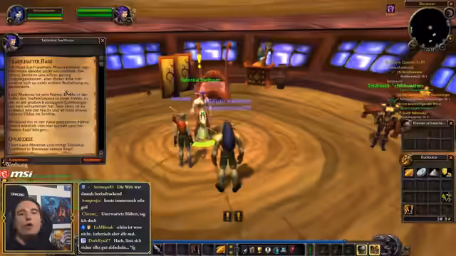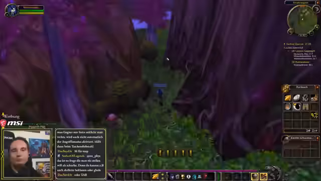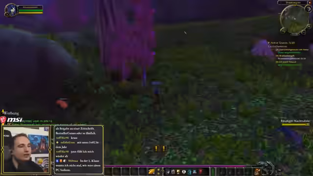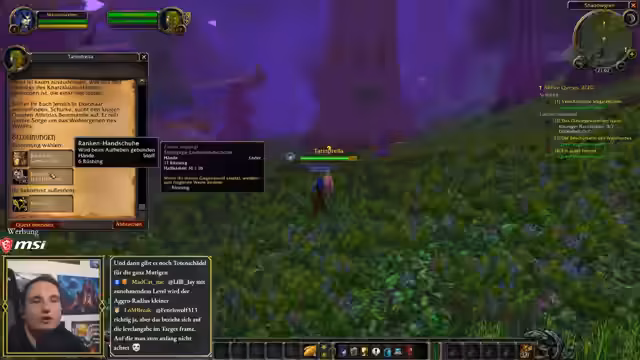 02:29:28Der Stream beginnt mit dem Einstieg von Maurice Weber in die Welt World of Warcraft. Er wählt einen Nachtelfen-Schurken und startet in Teldrassil. Zunächst kämpft er sich durch Ladebildschirme und probiert Add-ons wie Scrap für den intelligenten Müllverkauf. Er erhält seine erste Quest von Konservator Ilthalane, in der er zehn junge Nachtsäbler und vier junge Distel-Eber töten muss, um das Gleichgewicht der Natur wiederherzustellen. Anschließend nimmt er eine weitere Quest an, die ihn zur Suche nach Tarin Trella führt, einer Druide, die nach Shadow Glen zurückgekehrt ist.